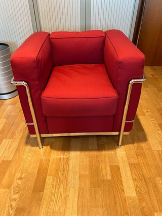 Iconica poltrona LC3 progettata da Le Corbusier per Cassina. Un classico del design moderno. Struttura tubolare in acciaio cromato. Cuscini di seduta e schienale rivestiti in tessuto rosso originale. Vendita dovuta al cambio d'ufficio.