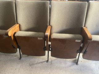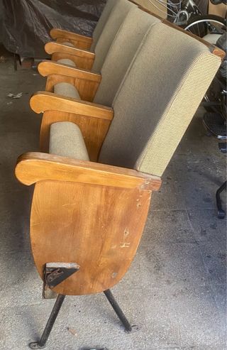 Poltroncine da cinema antiche in ottime condizioni, vendute tutte insieme. La struttura non è smontabile. Dimensioni: lunghezza 2,62 m, larghezza 60 cm.