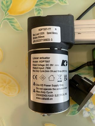 Attuatore lineare KADI KDPT007, ideale per poltrone elettriche. Motore per spostare o abbattere. Pulsante incluso con presa per caricare il telefono. Si vende con set completo di cavi per collegarsi direttamente alla corrente. Usato solo pochi mesi. PREZZO TRATTABILE. Modello: KDPT007. Tensione di ingresso: 100V-240V Uscita 29V DC. Ciclo di lavoro massimo: 10%. Include adattatore AC/DC.