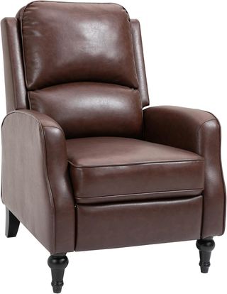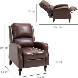 RECLINABILE: Lo schienale della poltrona relax massaggiante è reclinabile manualmente, e puoi fissarlo su due diverse altezze (90° o 150°). Il poggiapiedi estraibile si estende in contemporanea con lo schienale. ERGONOMICA: Lo schienale e la seduta della poltrona relax manuale sono super imbottiti e rivestiti con finta pelle marrone scuro, morbida al tatto e facile da pulire. ELEGANTE: Lo stile sta nei dettagli. Come gli eleganti piedini della poltrona relax manuale in legno con finitura nera, e nel rivestimento super realistico in finta pelle. ROBUSTA: Il telaio in metallo e i piedini in legno di abete ti garantiscono la poltrona r