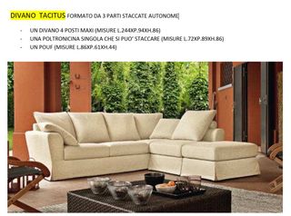 Divano Componibile Maxi + Poltrona + Pouf (Doppio Rivestimento!) Vendo divano estremamente versatile e spazioso, perfetto per chi cerca comodità e praticità. Il set è composto da 3 elementi indipendenti che puoi disporre come preferisci nel tuo salotto: Divano 4 Posti Maxi: Dimensioni generose per il massimo relax. Misure: L 244 x P 94 x H 86 cm Poltrona Singola: Utilizzabile come prolunga del divano o come seduta autonoma. Misure: L 72 x P 89 x H 86 cm Pouf Coordinato: Ideale come poggiapiedi o seduta extra. Misure: L 86 x P 61 x H 44 cm Interamente Sfoderabile: Pulizia e manutenzione semplicissime. DOPPIO RIVESTIMENTO INCLUSO
