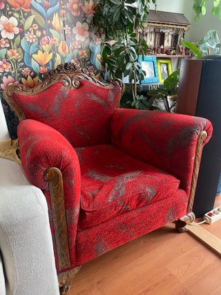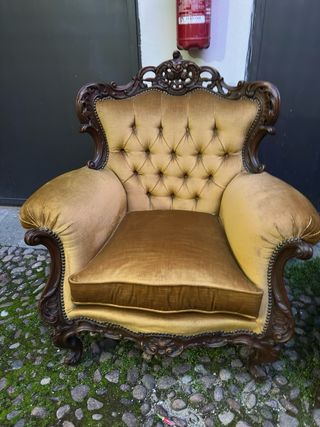Poltrona in legno in stile barocco di colore giallo senape. Il rivestimento è stato cambiato qualche anno fa. Necessita di restauro del legno a causa dell'usura. In vendita con cambio di indirizzo. Ideale per una casa rustica o vintage. Ci sono 2 poltrone nel caso foste interessati a un'altra. C'è anche un divano abbinato in un'altra pubblicità. Dimensioni della poltrona: 80 cm (lunghezza) x 70 cm (larghezza) x 90 cm (altezza)