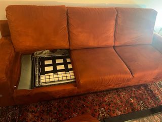 Divano letto grande e molto confortevole, dal design elegante e senza tempo, in un bellissimo colore rosso intenso (non arancione). Rivestito in un tessuto tipo velluto, morbido al tatto e completamente lavabile. Tutte le fodere sono sfoderabili, pensate per essere rimosse e lavate facilmente, rendendolo estremamente pratico per l’uso quotidiano. La struttura sfoderabile è pensata per la pulizia, non per il trasporto. ✔ Divano letto ampio ✔ Design raffinato e molto bello ✔ Tessuto tipo velluto lavabile ✔ Fodere completamente sfoderabili ✔ Comodo sia come divano che come letto Ideale per soggiorni di carattere, case di design