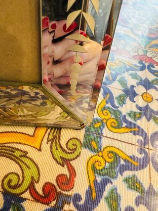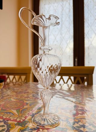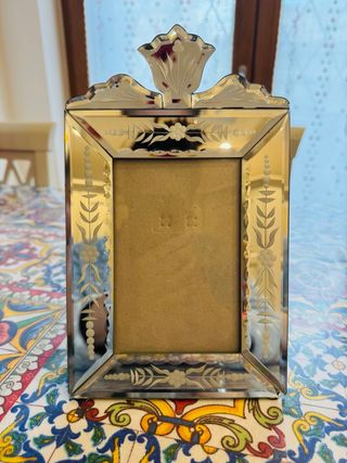 Elegante cornice portafoto in vetro di Murano, con decorazioni finemente incise. - Design raffinato con dettagli floreali. - Cornice in vetro trasparente e argentato. - Ideale per dare un tocco di classe alla tua casa. Piccola rottura nell’angolo a destra e macchia nera per antichità come evidenziato in foto.