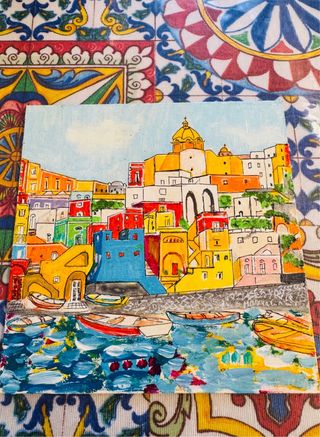Dipinto acrilico raffigurante Procida, con vivaci colori. - Tecnica mista acrilica su tela. - Rappresentazione del borgo marinaro e delle barche. - Firma dell'artista visibile in basso a destra.