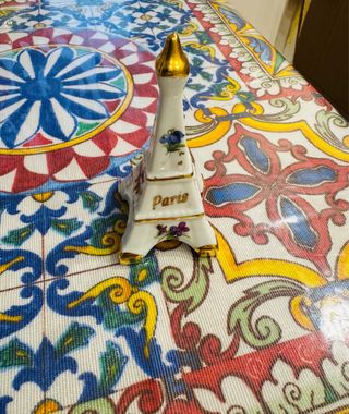 Deliziosa miniatura della Torre Eiffel, un pezzo da collezione proveniente da Limoges, Francia. Perfetta per aggiungere un tocco di eleganza parigina alla tua casa. - Decorata con fiori blu e viola. - Scritta Paris in oro. - Base e punta dorate.