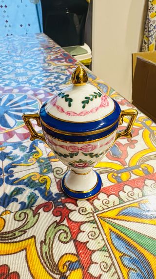 Elegante vasetto Limoges con decorazioni floreali e dettagli dorati. - Manici dorati. - Coperchio con pomello dorato. - Motivi floreali rosa e fogliame verde. - Bordi blu e oro.