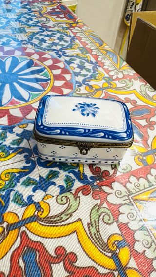 Deliziose scatoline in porcellana, perfette per custodire piccoli oggetti. - Decorate con motivi floreali blu. - Finitura smaltata lucida. - Dettagli in metallo dorato.
