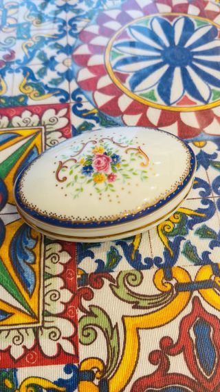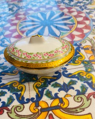 Elegante scatolina in porcellana Limoges, con dettagli dorati e un delicato motivo floreale. - Finitura in oro. - Decorazione floreale rosa e verde.