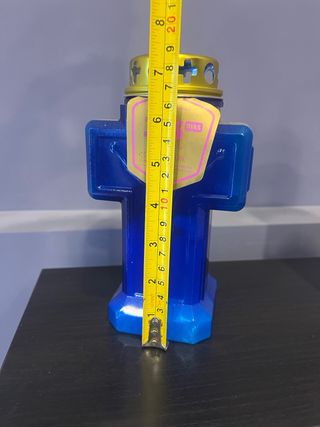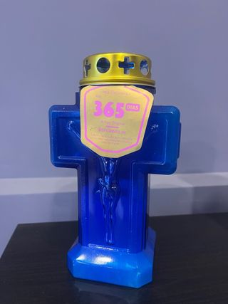 -1 candela elettrica a forma di croce , color blu , durata 1 anni ( non necessita di pile ) -1 candela di cera naturale ( papà) altezza 20 cm diametro 8