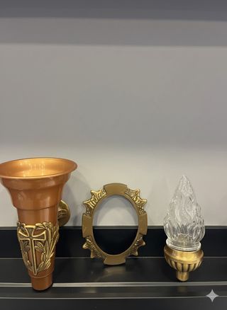 Set di accessori per cimitero in bronzo n 1 vaso ( braccetto più boccale ) n 1 lampada compresa di fiamma ( totale cm 16 ) n 1 cornice adatta per fotoceramica 9*12 tutto comprensivo di viti e varie per montaggio
