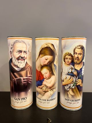Set di 3 candele decorative, ideali per il cimitero o come oggetti devozionali. - Raffigurano San Pio, la Madonna col Bambino e San Giuseppe. - Ogni candela presenta la scritta prega per noi. - altezza 20 cm / diametro 6 cm