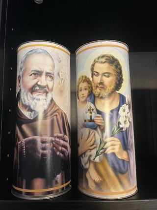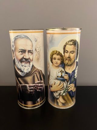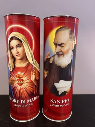 Set di due candele decorative, perfette per il cimitero o come oggetti devozionali. - Raffigurano San Giuseppe con Gesù Bambino e Padre Pio. altezza 20 cm diametro 8
