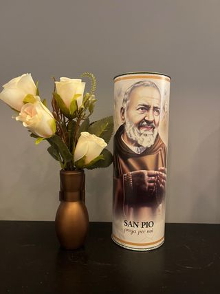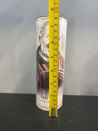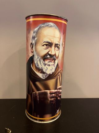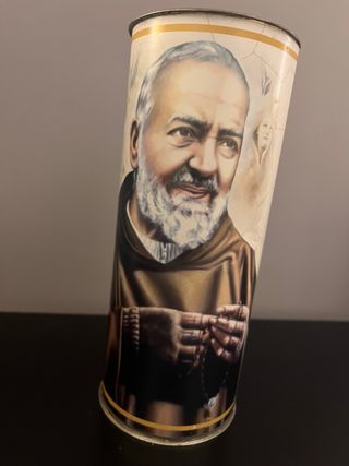 Candela decorativa con l'immagine di Padre Pio, ideale per cimiteri o come oggetto devozionale. Durata 4/5 gg circa altezza 20 cm diametro 8 cm