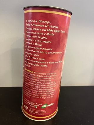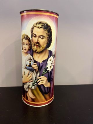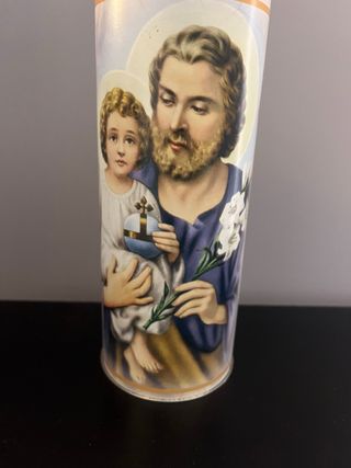 Candela decorativa con immagine di San Giuseppe, adatta per cimiteri o come oggetto devozionale. - Raffigurazione di San Giuseppe con Gesù Bambino. - Durata 4/5 gg circa - altezza 20 cm - diametro 8 cm