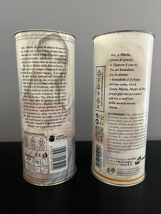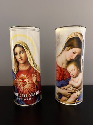 Coppia di candele decorative con immagini sacre. - Raffigurano la Madonna con Bambino e la Madonna con il Sacro Cuore. durata 4/5 gg circa altezza 20 cm diametro 8 cm