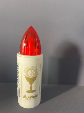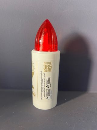 Lampada a LED per cimitero, con un design a fiamma rossa e base bianca. Progettata per durare 1 anno non necessita di pile