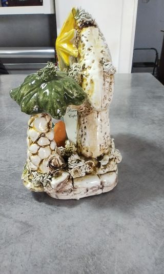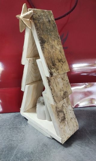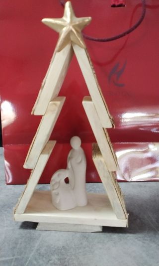 Deliziosa decorazione natalizia a forma di albero stilizzato, con un piccolo presepe al suo interno. - Struttura in legno grezzo fatto a mano. - Figure del presepe in ceramica. - Stella dorata sulla sommità.