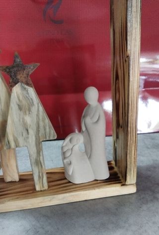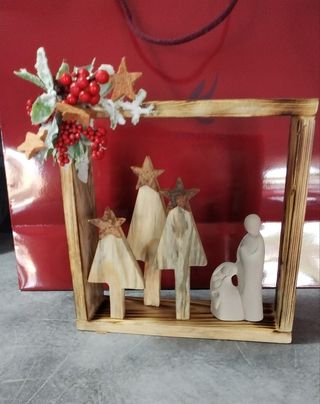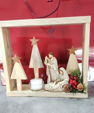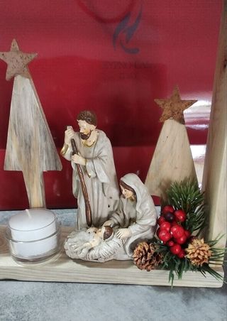 Bellissima decorazione natalizia per la tua casa da appendere o appoggiare. - Alberi in legno con stelle. - Personaggi della natività. - Candela inclusa.
