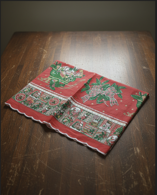 Tovaglia Natalizia rettangolare perfetta per apparecchiare la tavola durante le feste con un tocco di tradizione e allegria. Motivo classico e dettagliato, con un campo centrale rosso intenso e una ricca bordatura che include elementi natalizi come agrifoglio, fiocchi, slitte di Babbo Natale, e piccole scene invernali/natalizie. È un tessuto robusto, ideale per le cene di famiglia. Stampa: Fantasia natalizia tradizionale con bordi decorativi Condizioni: Ottime condizioni (Usata pochissimo o come nuova) Larghezza: 127 cm Lunghezza: 158 cm Ideale per tavoli medi/piccoli, si prega di verificare le misure del proprio tavolo.