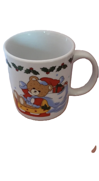 Tazza / Mug natalizia in ceramica bianca, perfetta per le tue colazioni o merende durante il periodo delle feste. La tazza presenta un allegro e tradizionale motivo natalizio che si ripete tutt'intorno: un tenero orsetto di peluche vestito da Babbo Natale, che pattina sul ghiaccio con una slitta piena di regali. Il bordo superiore è decorato con classiche foglie di agrifoglio rosse e verdi. Il design è vintage e crea subito un'atmosfera calda e accogliente. Dettagli: Articolo: Tazza / Mug Materiale: Ceramica (di colore bianco) Design: Orsetti natalizi che pattinano, Agrifoglio e Neve. Colore: Bianco con stampe classiche