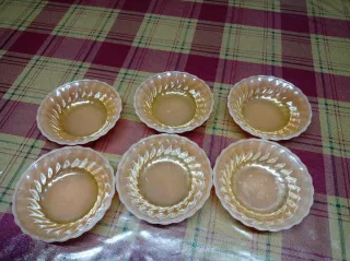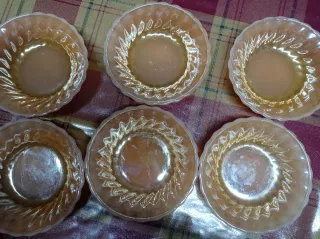 Elegante set di sei ciotole in vetro con finitura iridescente arancio. - Design con motivo a spirale. - Bordo smerlato.