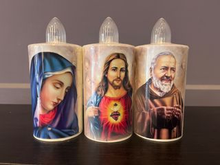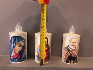 Set di tre candele elettriche per cimitero, con un'autonomia di circa 60 giorni. ( non necessitano di pile ) - Immagini sacre stampate. - altezza 14 cm in plastica dura