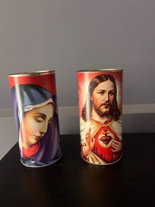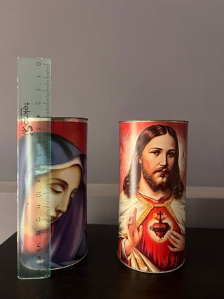 Set di due candele decorative, ideali per il cimitero o come oggetti devozionali. - Raffigurano il Sacro Cuore di Gesù e la Madonna. - altezza 14 cm / diametro 6 cm .