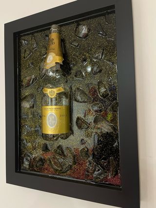 Bellissimo quadro decorativo con una bottiglia Armand de Brignac frammentata. - Pezzi di vetro dorato incastonati su sfondo nero. - Cornice nera elegante. - Targhetta commemorativa inclusa.