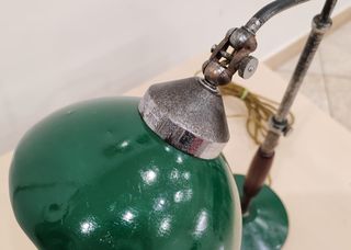 ***Lampada Ministero Vintage Anni 50/60 – Verde Iconico*** DESCRIZIONE Splendida e autentica Lampada da Tavolo Modello "Ministero" (o Ministeriale), un classico del design industriale italiano della metà del Novecento. Caratterizzata dall'iconico paralume a cupola in metallo verde e dalla struttura regolabile, questo pezzo porta con sé tutto il fascino degli storici uffici pubblici italiani. Dettagli dell'oggetto: Marca/Modello: Lampada Ministero (Etichetta originale ancora presente sotto la base). Materiali: Metallo smaltato verde, stelo cromato/brunito con impugnatura in legno tornito. Regolazioni: Braccio snodabile