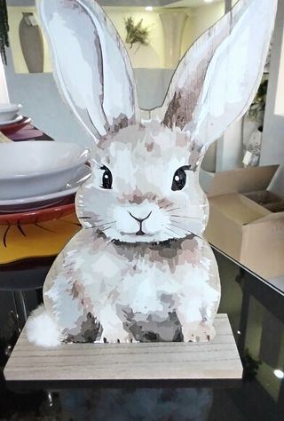 Delizioso coniglietto decorativo serigrafato, perfetto per aggiungere un tocco primaverile alla tua casa. - Design unico con finitura serigrafata. - Base in legno per una maggiore stabilità.