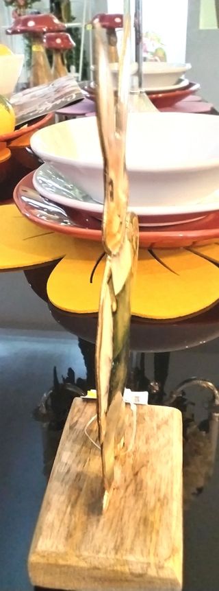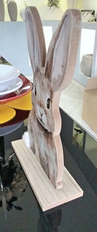 Delizioso coniglietto decorativo, perfetto per aggiungere un tocco primaverile alla tua casa. - Realizzato in legno. - Dettagli con sfumature di beige e marrone. - Base in legno per una facile esposizione.
