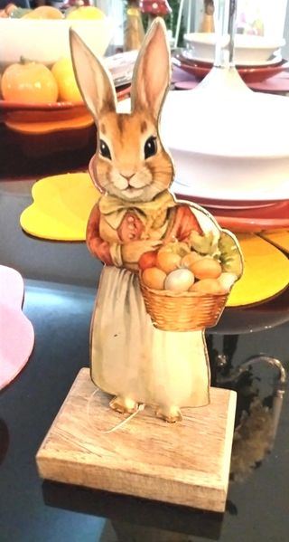 Delizioso coniglietto pasquale in latta, perfetto per decorare la tua casa durante le feste. - Base in legno per una maggiore stabilità. - Dettagli colorati e vivaci su entrambi i lati. - Cestino pieno di uova e verdure.