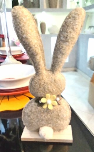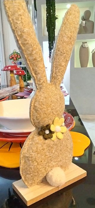 Grazioso coniglietto decorativo, perfetto per aggiungere un tocco primaverile alla tua casa. - Realizzato in tessuto e lana. - Dettagli floreali. - Base in legno.
