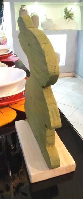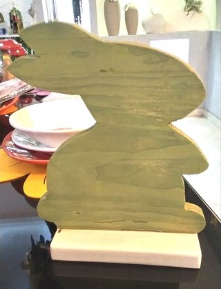 Un coniglio decorativo in legno, perfetto per aggiungere un tocco di stile alla tua casa. - Realizzato in legno a mano. - Colore verde e beige.