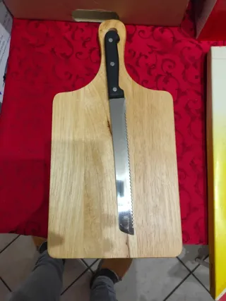 Set composto da tagliere in legno e coltello. - Tagliere con manico sagomato. - Coltello con impugnatura ergonomica.