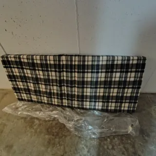 Materasso con una classica fantasia a scacchi. Usato per letto pieghevole infatti, come si vede in foto, la parte centrale è quella più schiacciata però è ancora in buono stato. - Rivestimento in tessuto. - Bordatura bianca.