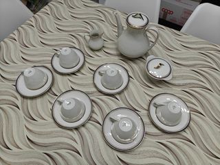 Servizio in porcellana bavarese con profili in oro zecchino mai usato. Il servizio è composto da: - 12 tazzine con 11 piattini (1 si è rotto) - lattiera - caffettiera - 12 piatti piani - zuppiera - 2 vassoi