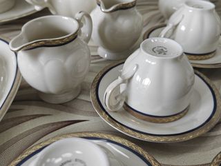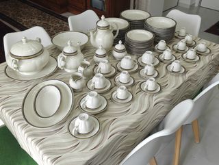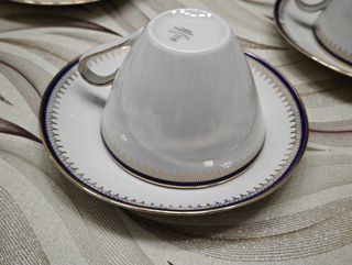 Elegante servizio in porcellana color bianco latte con profili blu e oro zecchino, mai usato. Il servizio si compone di: - 24 piatti piani - 12 piatti fondi - 12 piatti frutta - 12 tazzine da caffè con piattino - 6 tazze da tè con piattino - 2 zuccheriere - 2 lattiere - 1 teiera - 1 caffettiera - 1 zuppiera - 1 vassoio grande - 1 vassoio piccolo - 1 piatto piano grande