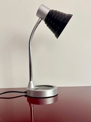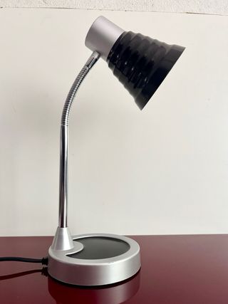Lampada da tavolo dal design essenziale con richiami Space Age, realizzata con struttura in metallo cromato, base in plastica satinata color argento e paralume in metallo nero. Il braccio flessibile permette di orientare la luce dove serve, rendendola perfetta per scrivania, comodino o angolo lettura. Caratteristiche: Diametro base: 13 cm Altezza: 37 cm Paralume in metallo nero Braccio flessibile orientabile Attacco E14 (lampadina non inclusa) Funzionante, in buone condizioni generali con minimi segni del tempo Un punto luce pratico e di carattere per ambienti dal gusto vintage e retrò futuristico.