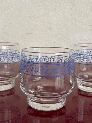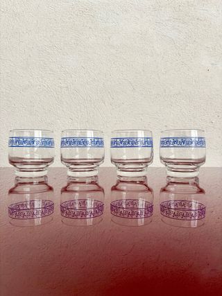 Set composto da 4 bicchieri vintage degli anni ’70, realizzati in vetro trasparente con fascia decorativa floreale di colore blu. Il decoro corre lungo tutta la circonferenza e conserva ancora oggi brillantezza e definizione. Modello tipico di quel periodo, ideale per acqua, soft drink o cocktail. Un oggetto dallo stile sobrio e retrò, perfetto per completare una tavola dal gusto vintage o per essere esposto in una vetrina. Condizioni ottime, senza crepe né sbeccature. Minimi segni del tempo compatibili con l’età. Dimensioni: Diametro 6,5 cm circa Altezza 7 cm circa