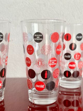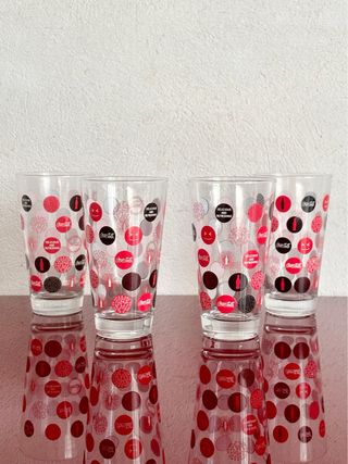 Set di quattro bicchieri Coca-Cola in edizione speciale, perfetti per gli appassionati del marchio. Il design presenta un motivo a pois rossi e neri con dettagli grafici. - Capacità: 0,3 litri. - Materiale: Vetro. - Misure: diametro Max: 8 cm altezza: 15 cm Condizioni perfette, nuovi mai usati