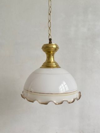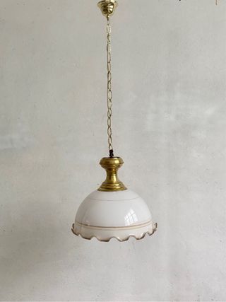 Elegante lampadario vintage in vetro bianco con finiture in metallo ottonato, risalente agli anni ‘70/‘80. Il diffusore a cupola con bordo ondulato regala un tocco raffinato e senza tempo, ideale per ambienti classici, retrò o shabby chic. Dettagli: • Materiali: vetro e metallo ottonato • Epoca: anni ‘70/‘80 • Dimensioni: diametro circa 38 cm, altezza totale circa 100 cm • Condizioni: ottime condizioni generali; le parti metalliche sono state pulite e lucidate, pronte all’uso Un pezzo autentico di design vintage, perfetto per cucine, soggiorni, ingressi o taverne con arredi dal fascino retrò.