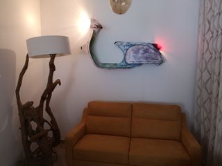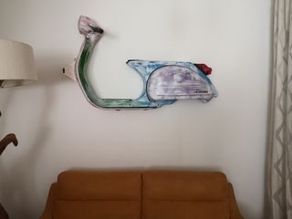 Vespa px 200, tagliata a metà e appesa come se fosse un quadro possibilità di inserire il trasformatore per poter accedere le luci e usarla come lampada