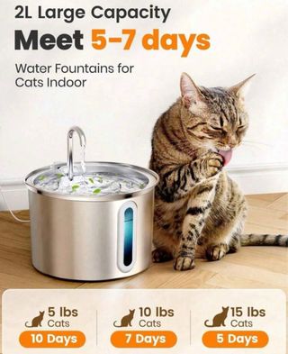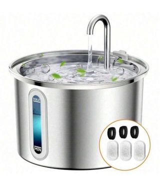 Fontana d'acqua in acciaio inossidabile per gatti, con una capacità di 3,2 litri. Il design moderno si adatta a qualsiasi ambiente. - Materiale: Acciaio inossidabile - Capacità: 3,2 litri - Indicatore di livello dell'acqua - Include filtri