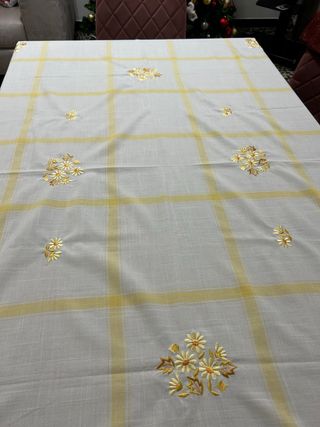Elegante tovaglia con ricami floreali e motivo a quadri. - Ricami floreali dorati. - Motivo a quadri gialli. - Tessuto di qualità.