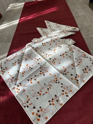 Set composto da una tovaglia e otto tovaglioli in cotone, con un delicato motivo floreale. - Design con fiori arancioni e bianchi. - Bordo smerlato sulla tovaglia. Tutto nuovo !!