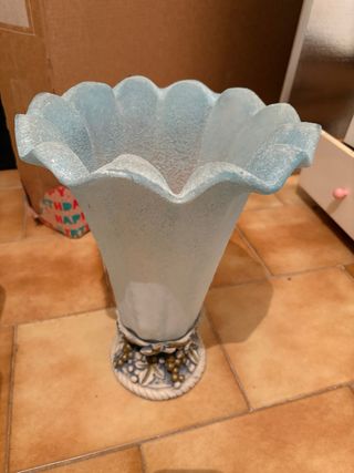 Elegante vaso con finitura satinata e base decorativa. - Finitura in vetro satinato. - Base in resina con decorazioni a tema uva e foglie. - Bordo superiore ondulato.