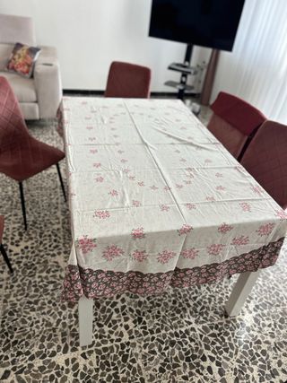 Elegante tovaglia rettangolare con un delicato motivo floreale e bordo decorativo. Perfetta per aggiungere un tocco di colore alla tua tavola. - Realizzata in cotone resistente. - Include tovaglioli coordinati.