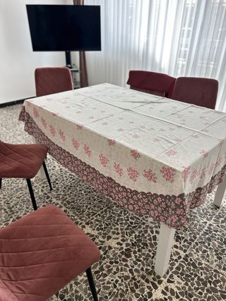 Elegante tovaglia con un motivo floreale di rose rosa. Include sei tovaglioli coordinati tutto ricamato a mano 100%cotone . Dimensioni 280/150 più 12 tovaglioli - Design con rose rosa e foglie verdi. - Set completo per la tavola.
